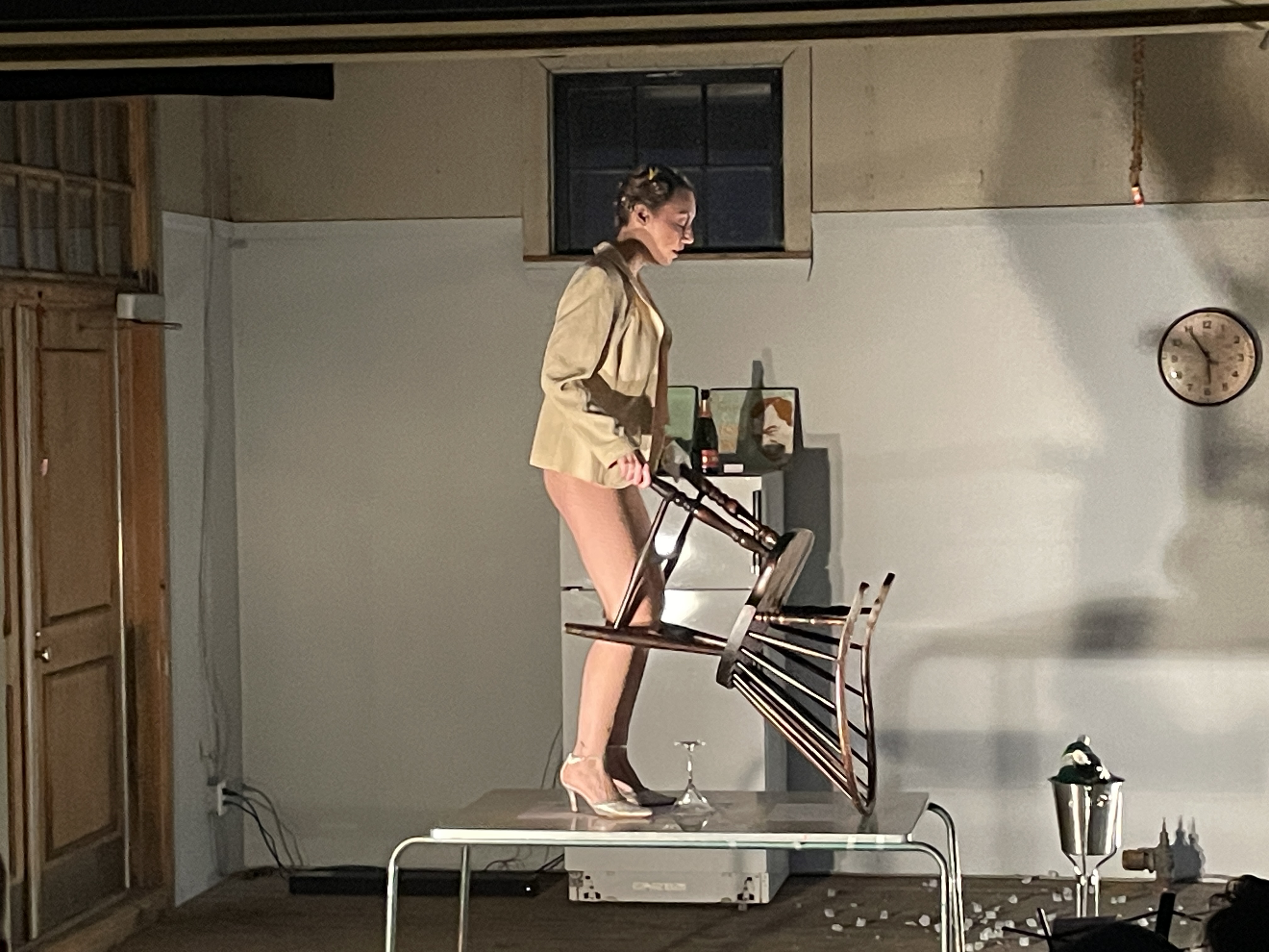 This one woman show unfolds within an installation composed of martini glasses, fishing gear, laboratory equipment, and a dead fish.